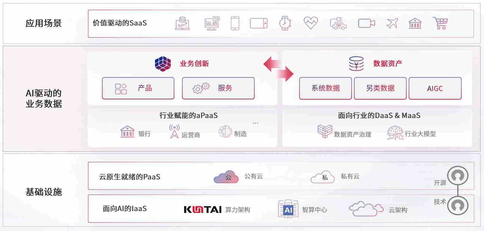 数字时代,,,围绕企业数字化转型的关键要素,,Z6尊龙数码开创性的提出数云融合战略和技术体系框架,,着力在云原生、、、、数字原生、、AI原生和信创产业上架构产品和服务能力,,,,为处在不同数字化转型阶段的快消零售、、、汽车、、、、金融、、、医疗、、、、政企、、教育、、、运营商等行业客户提供泛在的敏捷IT能力和融合的数据驱动能力,,构建跨界融合创新的数字业务场景和新业务模式,,,助力企业级客户建立面向未来的核心能力和竞争优势,,全面推动社会的数字化、、、、智能化转型升级。。。。